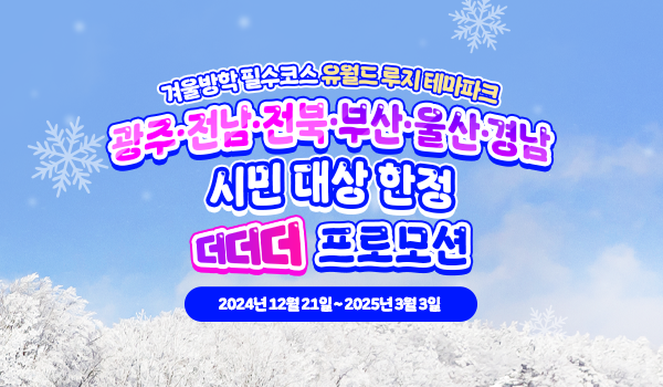 광주·부산·울산·전남·전북·경남시민 대상 한정 더💙더💜더 프로모션 💛 시민할인 대상 지역 더 확대✔ 광주·부산·울산·전남·전북·경남 지역민 모두 시민할인 가능! 💚 유월드 콤보티켓 가격 더더 할인✔ 롱데이 콤보루지 […]