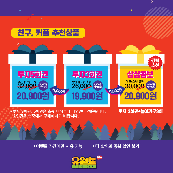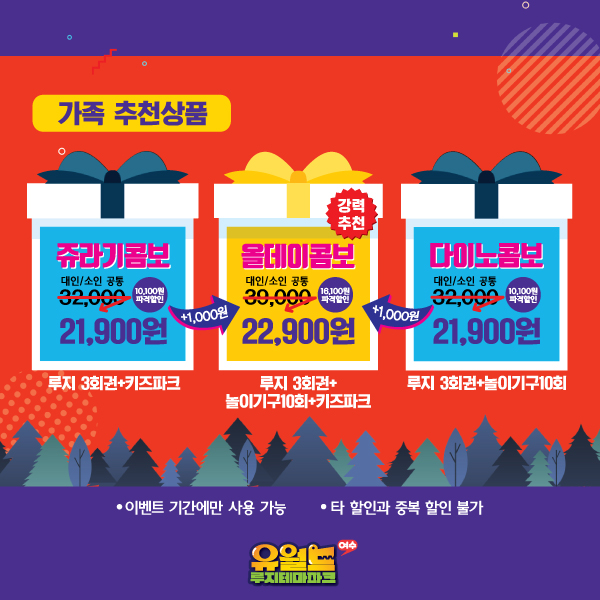 ✅이벤트 기간 : 12월 5일 ~ 12월 24일⭐최대 41%의 파격 할인율!⭐온 가족이 즐기기 좋은 가족 추천상품부터친구, 커플끼리 즐기기 좋은 추천상품까지 골고루 진행하는 파격세일~