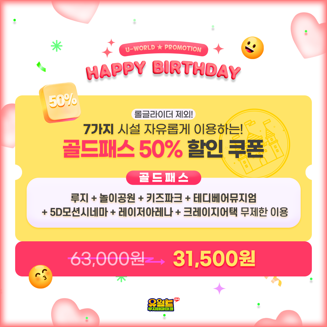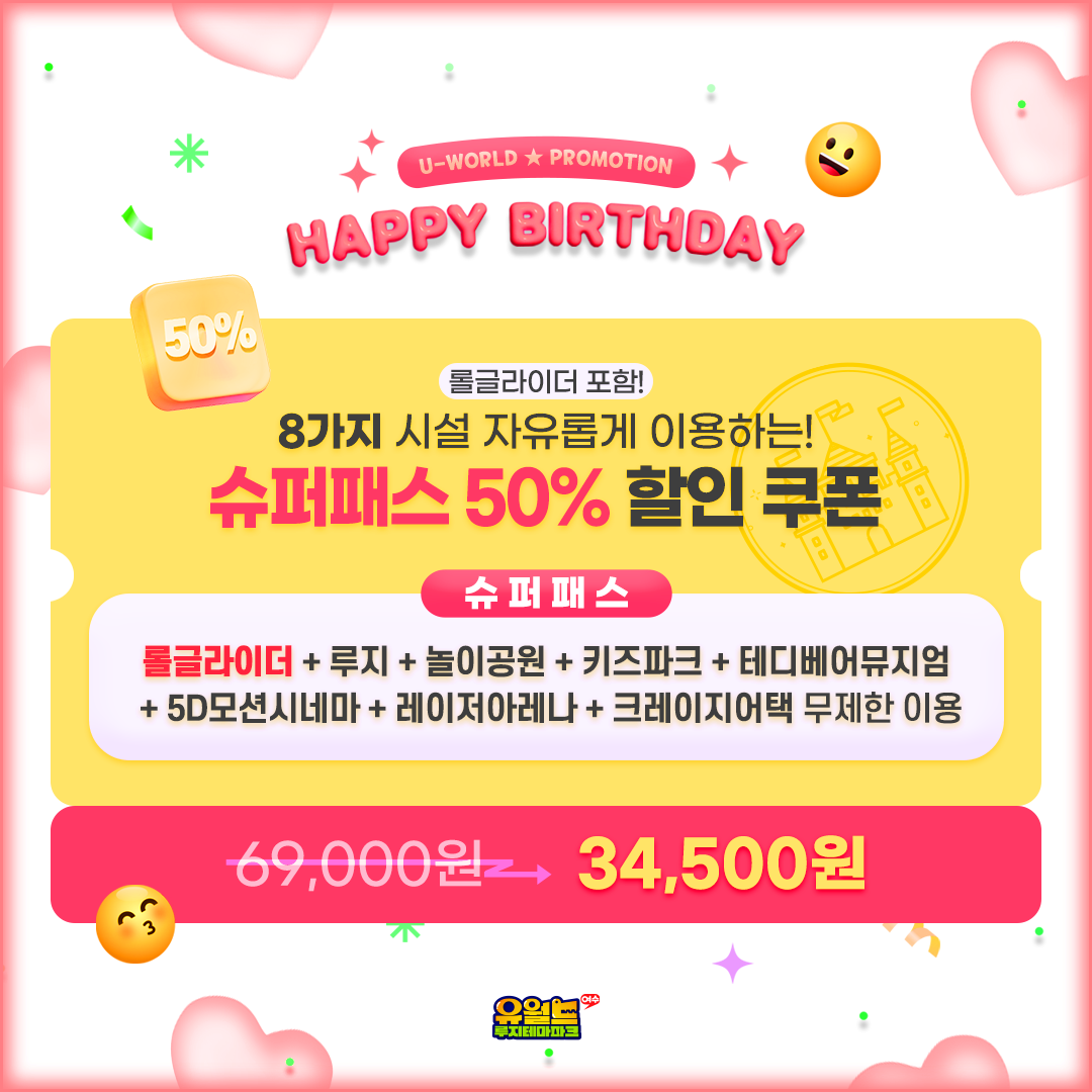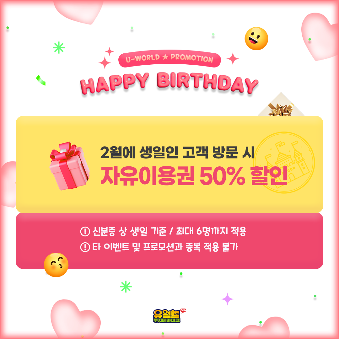 유월드 생일★축하 프로모션💖 2월에 생일인 고객 유월드 방문 시 자유이용권 50% 할인!