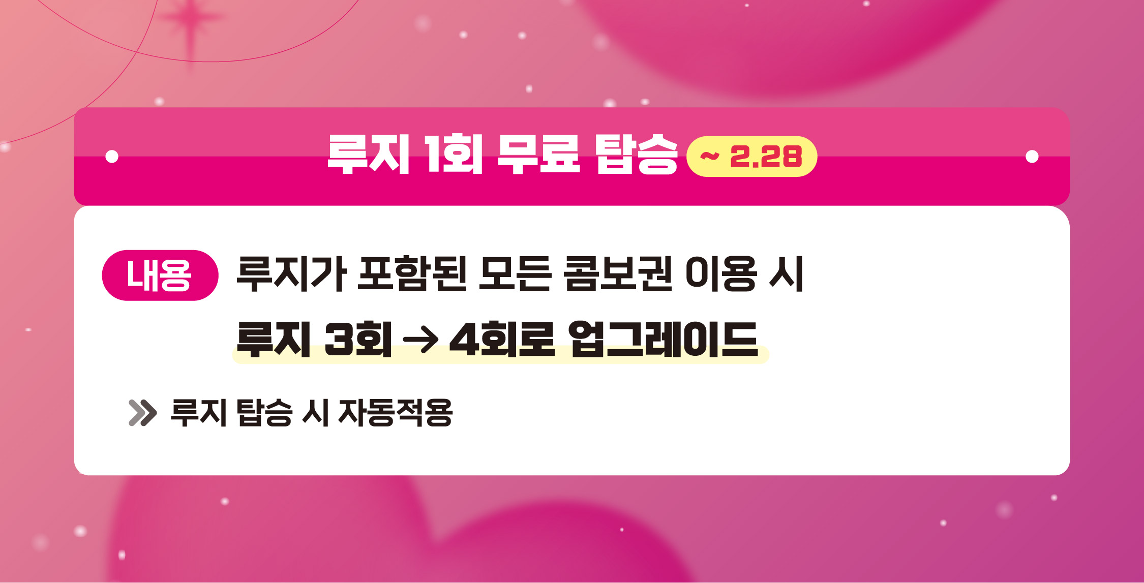 ๐Ÿ’ ๋ฃจ์ง€ 1ํšŒ ๋ฌด๋ฃŒ ํƒ‘์Šน(์ข…๋ฃŒ)